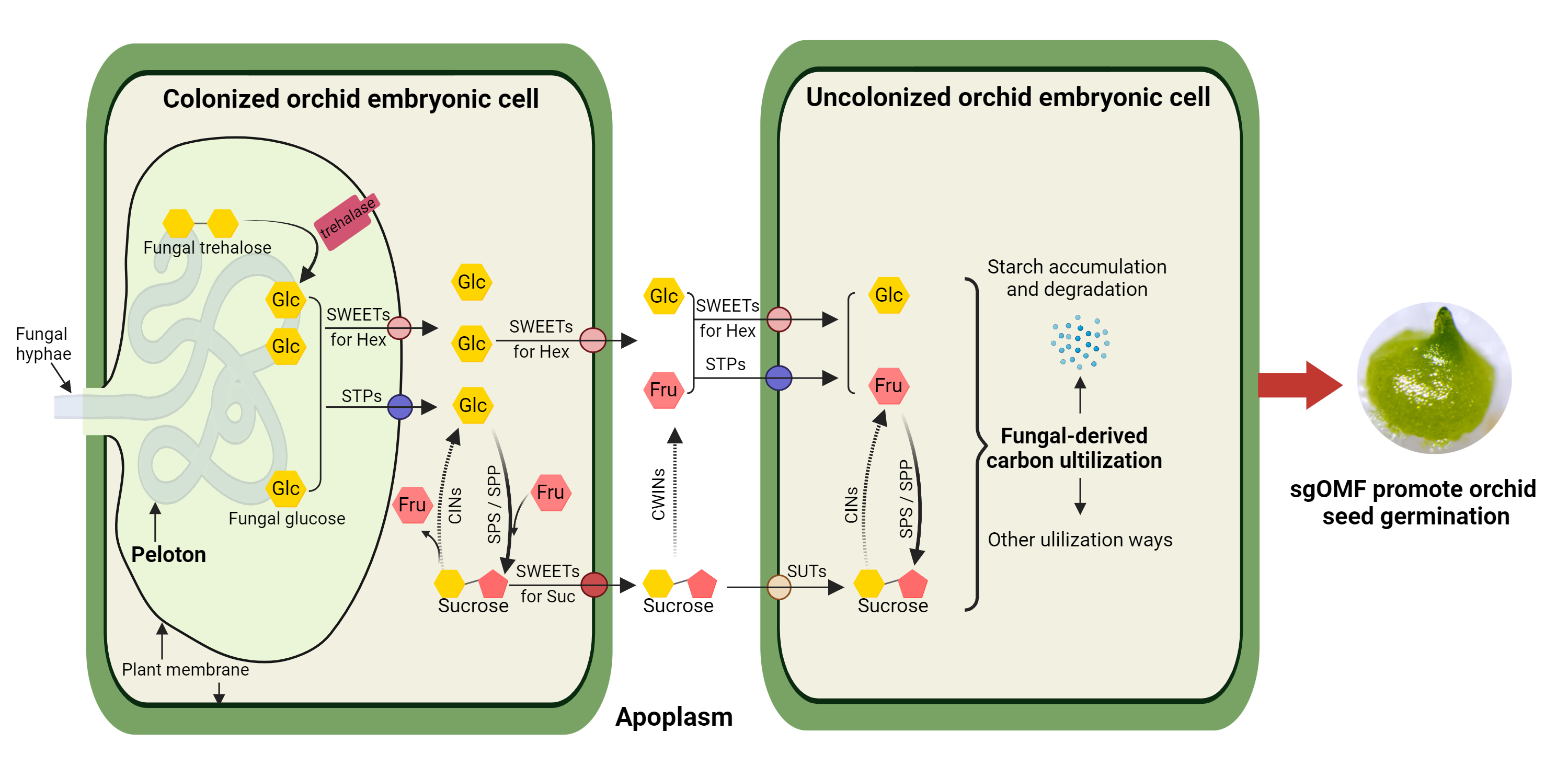 碳是植物种子萌发的核心元素。真菌成分分析和非共生萌发证据显示,葡萄糖和海藻糖是真菌最重要的碳储备物质,也是能被兰科种子利用的碳源形式,兰科种子通过降解真菌菌丝圈和活体菌丝吸收的方式,从真菌获得这两种糖。然而,植物通常不能利用海藻糖作为生长发育碳源。为解释这一现象,团队对兰科海藻糖水解酶开展基因家族分析和蛋白结构预测,结合组学和实验证据,提出兰科植物具有特化的利用真菌海藻糖机制的新观点,通过扩张其海藻糖水解酶家族,将真菌海藻糖降解为葡萄糖。随后,兰科种子利用葡萄糖转运蛋白SWEETs和STPs,将真菌来源的葡萄糖吸收至胚细胞内,并通过胚内细胞间的转运和代谢,促进兰科种子萌发。