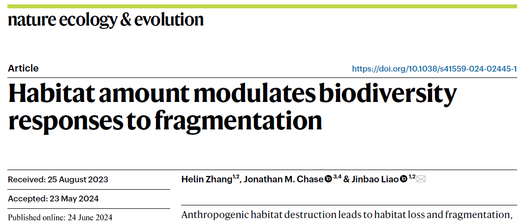近日,bat365中文官方网站/生物多样性研究院廖金宝课题组在Nature Ecology & Evolution期刊上发表了题为“Habitat amount modulates biodiversity responses to fragmentation”的研究论文(https://www.nature.com/articles/s41559-024-02445-1)。该研究发现生境损失严格调控并诱导了生物多样性对生境破碎化的单峰响应,可为生物多样性保护与管理提供全新的理论视角与决策支持,具有极其重要的保护生物学意义。