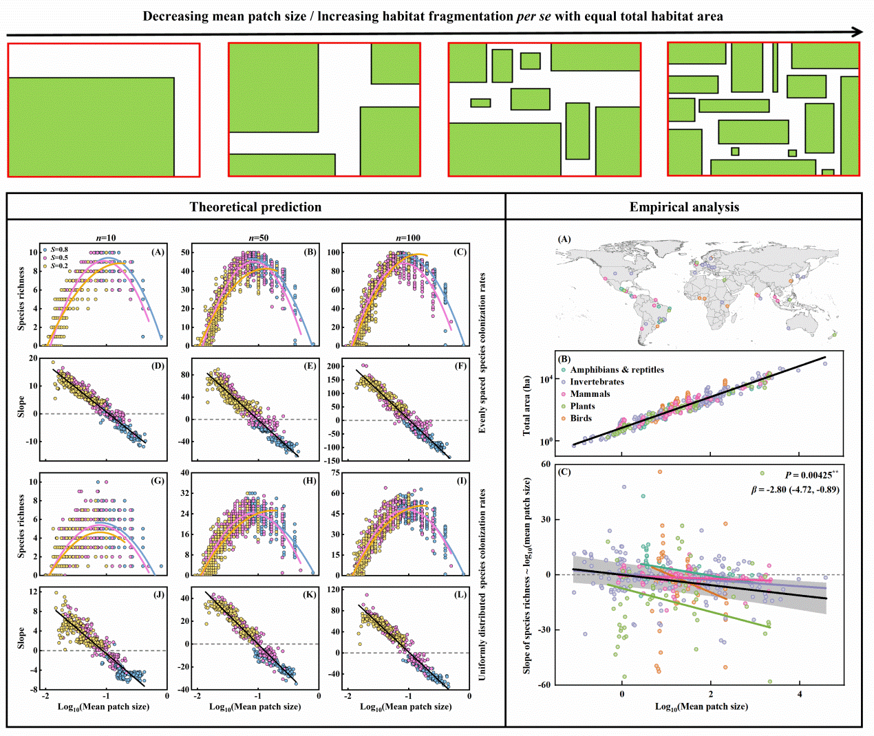 基于该科学争论,廖金宝课题组构建了具有局域竞争-定殖权衡的破碎化集合群落模型。通过数学分析与数值模拟发现,生境损失严格调控并诱导了生物多样性对生境破碎化(即降低平均斑块大小)的单峰响应。具体而言,当生境总体损失较少时,生境破碎化反而增加了生物多样性;而在中度生境损失条件下,生物多样性对生境破碎化产生了单峰响应;在生境损失较大的情况下,生境破碎化对生物多样性呈现负面效应。该理论预测可从局域竞争-定殖权衡(即竞争能力强的物种则其定殖能力弱)的角度进行解释:在生境损失较少的情况下,适度破碎化有利于具有定殖优势的物种在较小的斑块内存活,而不被强势竞争者排除,从而达到景观区域尺度上的相互共存;而当生境损失较为严重时,生境破碎化可使具有竞争优势的物种逐渐灭绝,从而降低了集合群落物种多样性。