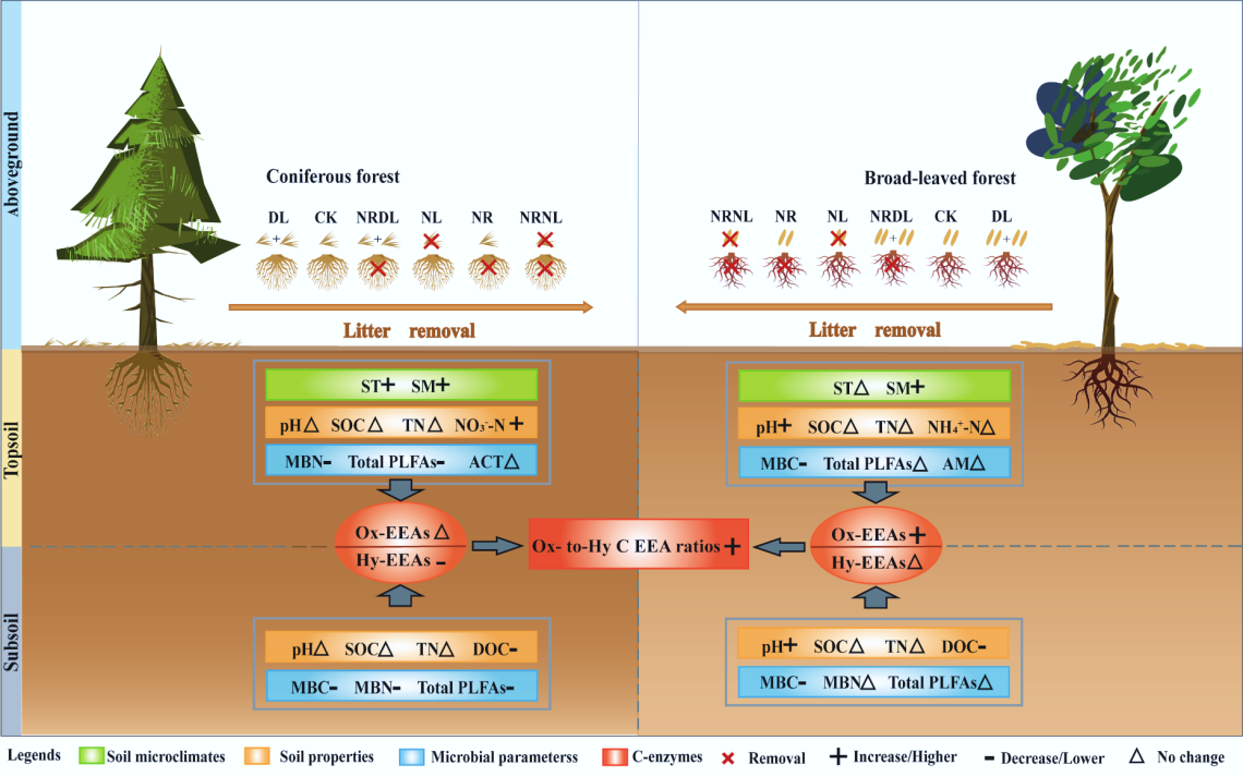 土壤碳降解酶是调控陆地生态系统凋落物和土壤有机碳分解的重要调控因子。然而,在不同的森林生态系统中,参与碳循环的酶对短期凋落物输入的响应尚不清楚。本研究中,测定并计算了不同森林类型的碳氧化酶、碳水解酶及其比值(碳氧化酶:碳水解酶)。两年的凋落物处理研究发现:凋落物添加对两种森林土壤中碳氧化酶、碳水解酶及其比值影响不显著。凋落物去除显著降低了针叶林土壤的碳水解酶,对碳氧化酶影响较小;不同的是,凋落物去除显著提高了阔叶林土壤的碳氧化酶,对碳水解酶影响较小。两种森林土壤中碳氧化酶和碳水解酶在凋落物去除下的不同变化可归因于初始土壤性质,其中针叶林土壤碳氮比较低导致碳水解酶的改变; 而阔叶林土壤微生物参数(如:微生物生物量碳,MBC)和土壤性质(如:可溶性有机碳, DOC)分别调控着表层土和底层土的碳氧化酶:碳水解酶比值。本研究揭示了亚高山针叶林和阔叶林土壤,在短期凋落物输入变化对碳循环的酶的影响及其驱动因素。研究结果以“Different regulatory mechanisms on carbon-degrading enzyme activities under short-term litter input manipulations in subalpine coniferous and broad-leaved forest soils”为题发表在Soil Biology and Biochemistry(IF = 9.8,中科院一区)上。bat365中文官方网站2023级博士生门修贤为论文第一作者,程晓莉教授为论文唯一通讯作者。原文链接:https://doi.org/10.1016/j.soilbio.2024.109512.