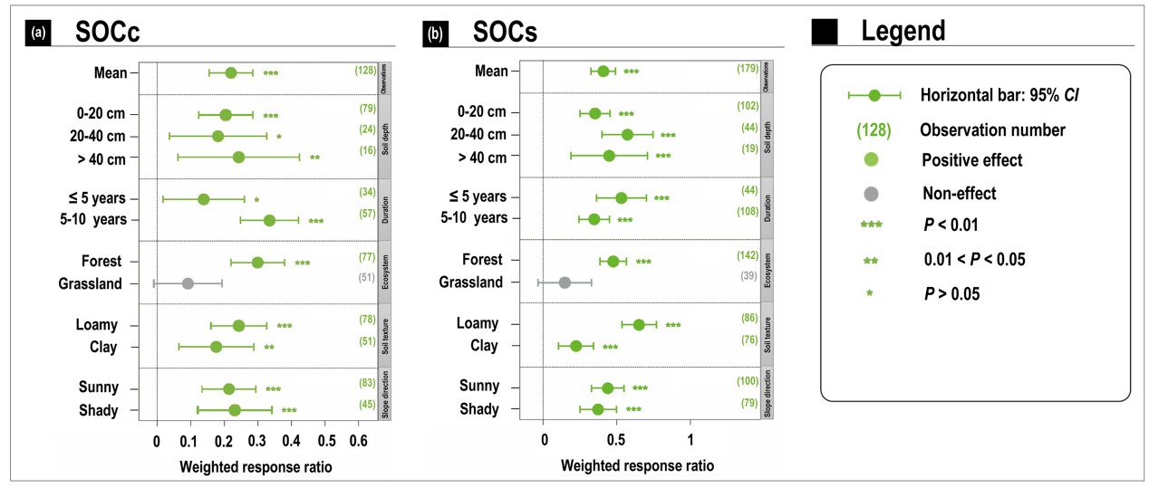 图2 退耕还林对土壤有机碳含量(SOCc,a)、土壤有机碳储量(SOCs,b)的影响