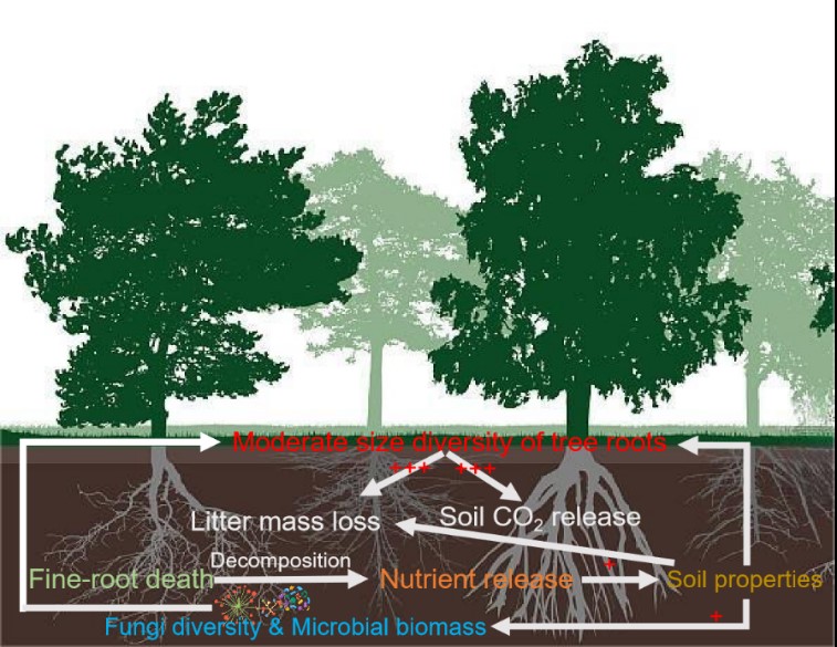 在热带森林生态系统中,关于凋落物分解的研究多集中在地上生物多样性对凋落叶分解和土壤呼吸的影响,而根系多样性对分解的过程及驱动机制尚不充分。本研究选取西双版纳热带雨林21种优势树种的细根,通过设置根系混合0、1、3、6、9、12、15、18和21个物种的梯度处理,每个处理21个重复,进行了360天的培养分解实验,并监测细根质量损失和CO2释放。结果表明随着细根多样性的增加,土壤性质、微生物多样性和真菌生物量呈非线性变化,在9、12和15种混合的中等多样性下,凋落物质量损失和土壤CO2释放量最大;非叠加效应分析也证实这3种混合处理对土壤CO2释放和凋落物质量损失的协同效应大于其它混合处理。此外,凋落物质量损失和土壤CO2释放路径分析表明土壤性质和微生物群落的间接影响大于细根多样性的直接影响。本研究结果表明热带森林细根多样性与凋落物分解和土壤CO2释放有密切关系,强调了全球变化情景下植物多样性在碳循环中的重要性。2020级博士研究生陈德赟为该论文第一作者,吴建平教授为通讯作者。中国科学院西双版纳热带植物园夏尚文副研究员参与了部分研究工作。研究得到国家自然科学基金(No. 31971497, 32371733)和“兴滇英才”等项目资助。