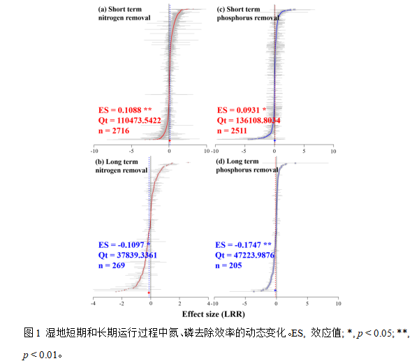 湿地是净化水体污染物的重要途径之一。而人工湿地作为一项低成本和高效率的水体污染物去除技术,自20世纪50年代以来在全球范围内得到了广泛的应用。湿地通过微生物活动、植物吸收、基质吸附和沉降等多种途径,削减流经水体内的污染物。而目前关于湿地污染物去除的研究,绝大多数集中在人工湿地设计(湿地类型、植物和基质种类选择等)、运行策略(曝气、外源物质添加、水力条件控制等)和环境因素(温度、污染负荷等)对污染物去除效率的影响上。但是,很少有研究对湿地在不同时间尺度的运行过程中污染物去除效率的变化,尤其是在长期运行过程中湿地去除污染物的稳定性与可持续性方面进行评估与报道。此外,由于受到环境条件与研究不确定性因素的制约,目前关于湿地去除污染物的稳定性与可持续性的研究难以得出一致性的结论。因此,本研究借助在全球范围内公开发表相关论文中提取的数据(共5701组)和meta分析的手段,在短期和长期两个湿地运行的时间尺度上,评估湿地对水体氮、磷污染物去除效率的动态变化,在湿地对污染的净化作用方面提供更为科学、全面的认识。