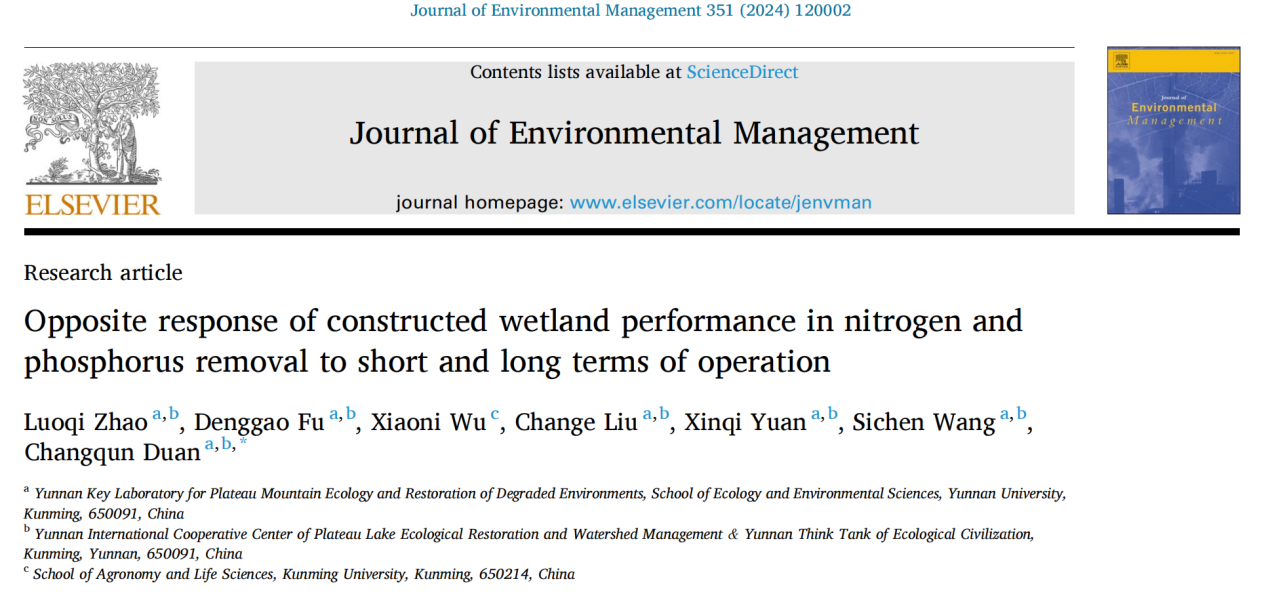 2024年1月1日,bat365中文官方网站污染与恢复生态学段昌群研究团队博士研究生赵洛琪在国际知名学术刊物Journal of Environmental Management在线发表了题为 “Opposite response of constructed wetland performance in nitrogen and phosphorus removal to short and long terms of operation”的研究论文,揭示了湿地对氮、磷污染物的去除效率在短期和长期运行过程中的动态变化。