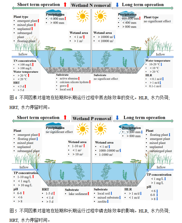 在湿地的运行过程中,湿地属性(面积、植物和基质种类)、污水性质(氮、磷浓度、pH、水温等)、水力条件(水力负荷、水力停留时间)、环境因素(温度、降水)和管理因素(曝气、外源碳添加)是影响污染物去除效率变化的主要因素。因此,本文对以上因素在湿地短期和长期运行过程中,对氮、磷污染物去除效率的影响进行了总结与归纳。研究结果表明,在高水力负荷的条件下,湿地在长期运行过程中的氮、磷去除效率显著下降(图4和5)。