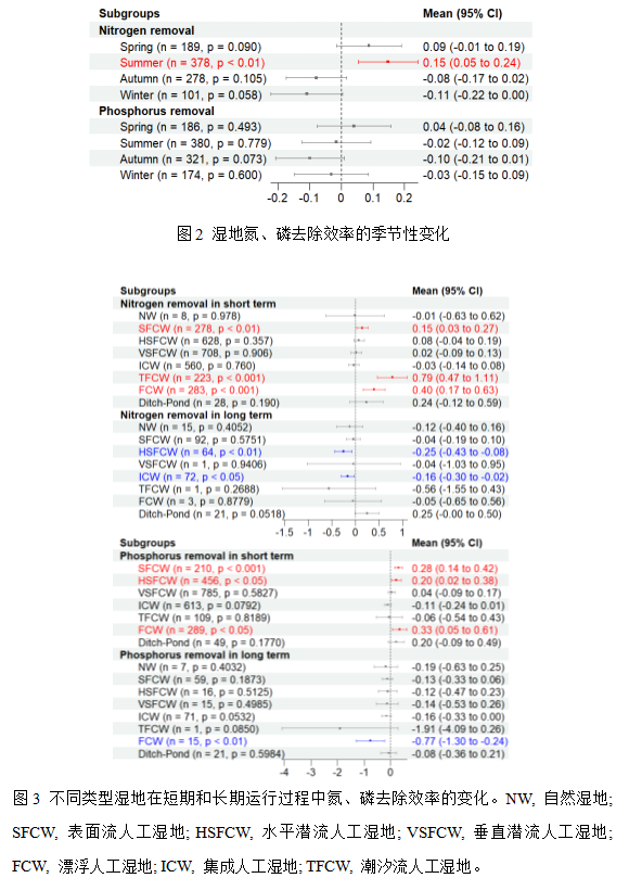 研究结果表明,湿地对氮、磷污染物去除的整体效率,在短期运行过程中(0-365天)显著上升,而在长期运行过程中(0-15年)显著下降(图1)。在不同的季节中,湿地的氮去除效率在春季和夏季上升,而在秋季和冬季下降;同时湿地的磷去除效率未表现出显著的季节性变化(图2)。在不同类型的湿地与人工湿地中,只有表面流人工湿地(SFCW, surface flow constructed wetland)的氮、磷去除效率在短期运行过程中显著增加,而长期运行过程中的氮、磷去除效率未发生显著变化(图3)。
