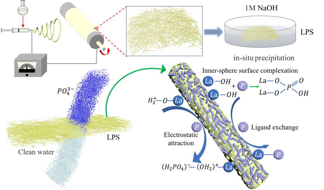 2. 文章“Separable lanthanum-based porous PAN nanofiber membrane for effective aqueous phosphate removal”采用先进的技术手段,静电纺丝法,制备了一种分散良好的镧基多孔聚丙烯腈纳米纤维(LPS),对磷的最大吸附量为218.5 mg P g-1 [La],La泄漏量仅为74 μg L-1,可以防止水体的二次污染。经LPS处理后,阳宗海水样的总磷可降至4.2 μg L-1,低于中国湖泊和水库地表水环境质量标准第一类标准值(10 μg L-1)。另外,膜状LPS方便固液分离,有望实现在天然水体处理中的大范围应用。由于LPS纳米纤维膜分散性好,也可作为基底材料掺杂其它元素用于去除水生态系统中的各种污染物。该文章发表在Chemical Engineering Journal期刊上,第一作者为博士生贾秀秀,通讯作者为胡广志研究员。