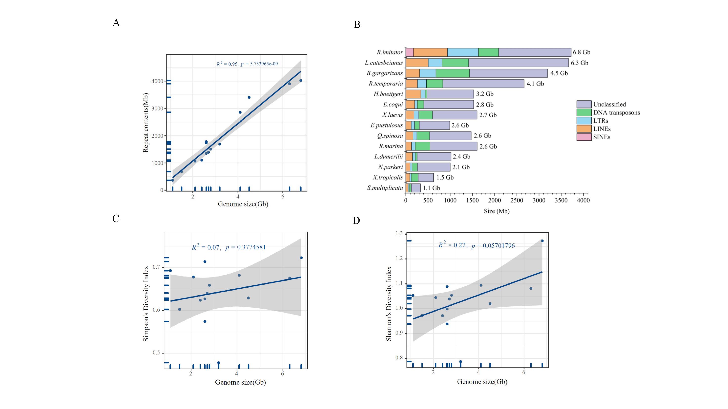 图1. 无尾目基因组大小与重复序列和转座元件多样性指数的关系