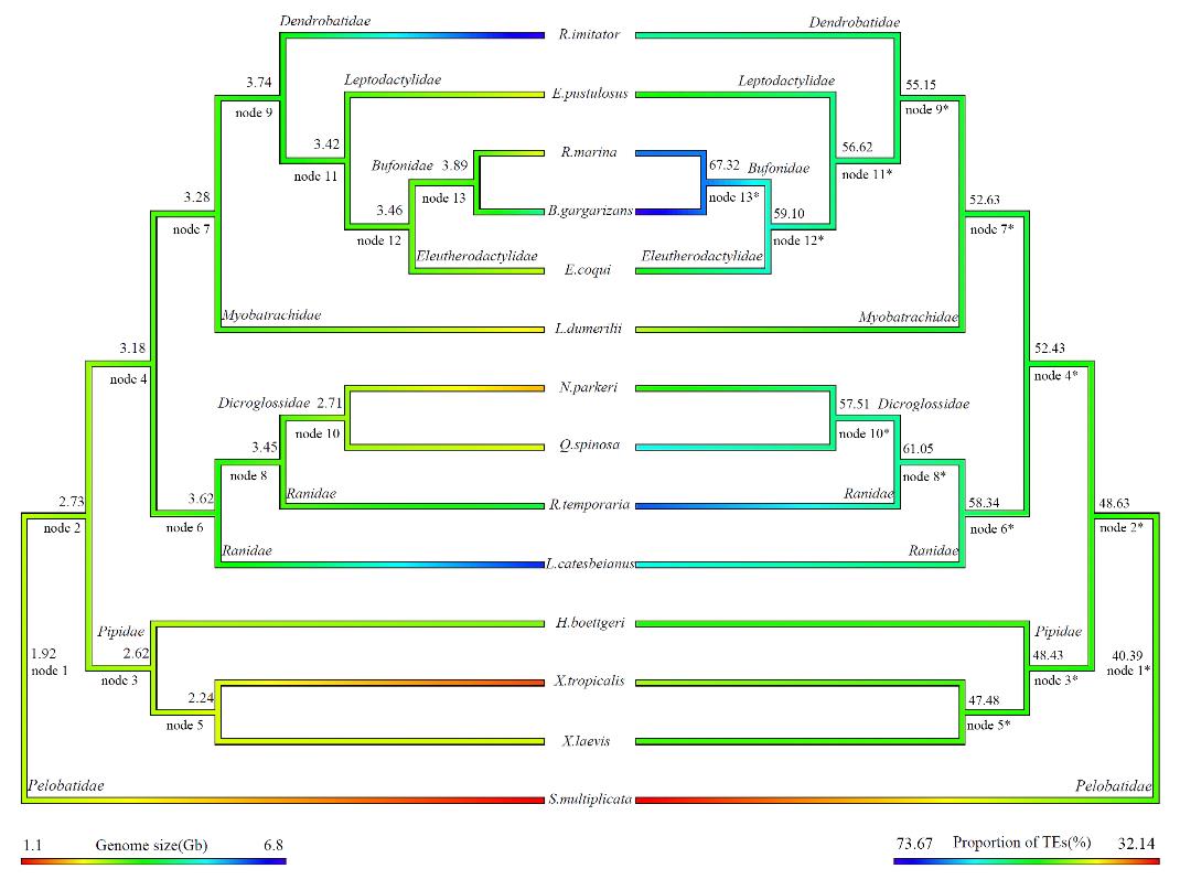 两栖动物在基因组大小方面表现出巨大的差异。由于过去全基因组数据集的缺乏,对两栖动物基因组大小变异背后的基因组特征和进化原因了解甚少。随着基因组测序技术在非模式物种中的广泛应用,两栖动物的基因组信息逐步得到解析,尤其集中在无尾目。为了解决这个问题,我们收集了14个无尾目物种的全基因组序列,其大小跨度为1.1到6.8 Gb。通过对多种基因组元件的注释和比较,研究了无尾目基因组大小变异的基因组特征,并进一步探讨了基因组大小是否与生境类型有关。