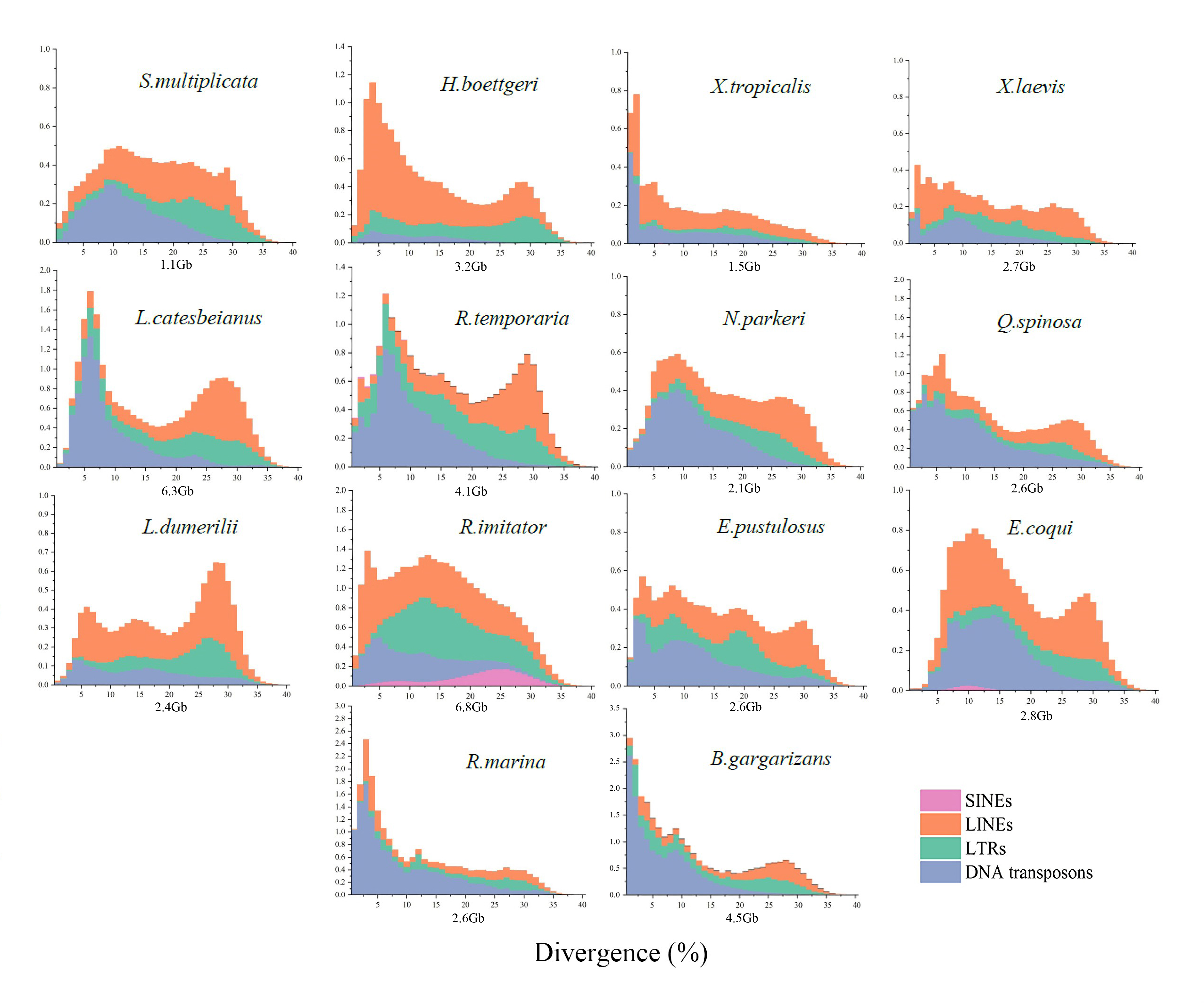 图2. 无尾目基因组大小的转座元件年龄分布景观。