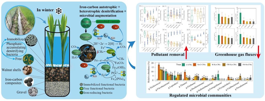 鉴于人工湿地在净化农田径流时存在污染物去除效能低(尤其在冬季)、温室气体排放通量高等问题,采取强化措施以提升其综合环境生态效益势在必行。课题组采用铁碳复合材料+农业废弃物核桃壳混合物作为人工湿地填料,并以游离和固定的形式向湿地中加入前期研究中优选出的好氧反硝化聚磷菌进行生物强化,构建出新型的强化人工湿地系统用以处理农田径流。结果显示,采取的强化措施显著提升了人工湿地对多种污染物的去除效能,并降低了湿地的温室气体排放通量。铁碳复合填料塑造了人工湿地中的微生物群落特征,提升了功能微生物的丰度;不同湿地处理系统中的差异微生物类群与其综合生态环境效益密切相关。论文提出了进一步应用该强化型人工湿地的建议。成果以 Agricultural runoff treatment by constructed wetlands filled with iron-carbon composites in winter: Performance augmentation by organic solids and denitrifying bacteria addition发表在农业工程领域期刊 Bioresource Technology(中科院一区,IF:11.4)上。资源与环境硕士生蔺如凤和赵永贵副教授为第一作者,常军军教授为通讯作者,寸得寿博士后对研究做出重要贡献。全文链接https://www.sciencedirect.com/science/article/abs/pii/S0960852423011203.