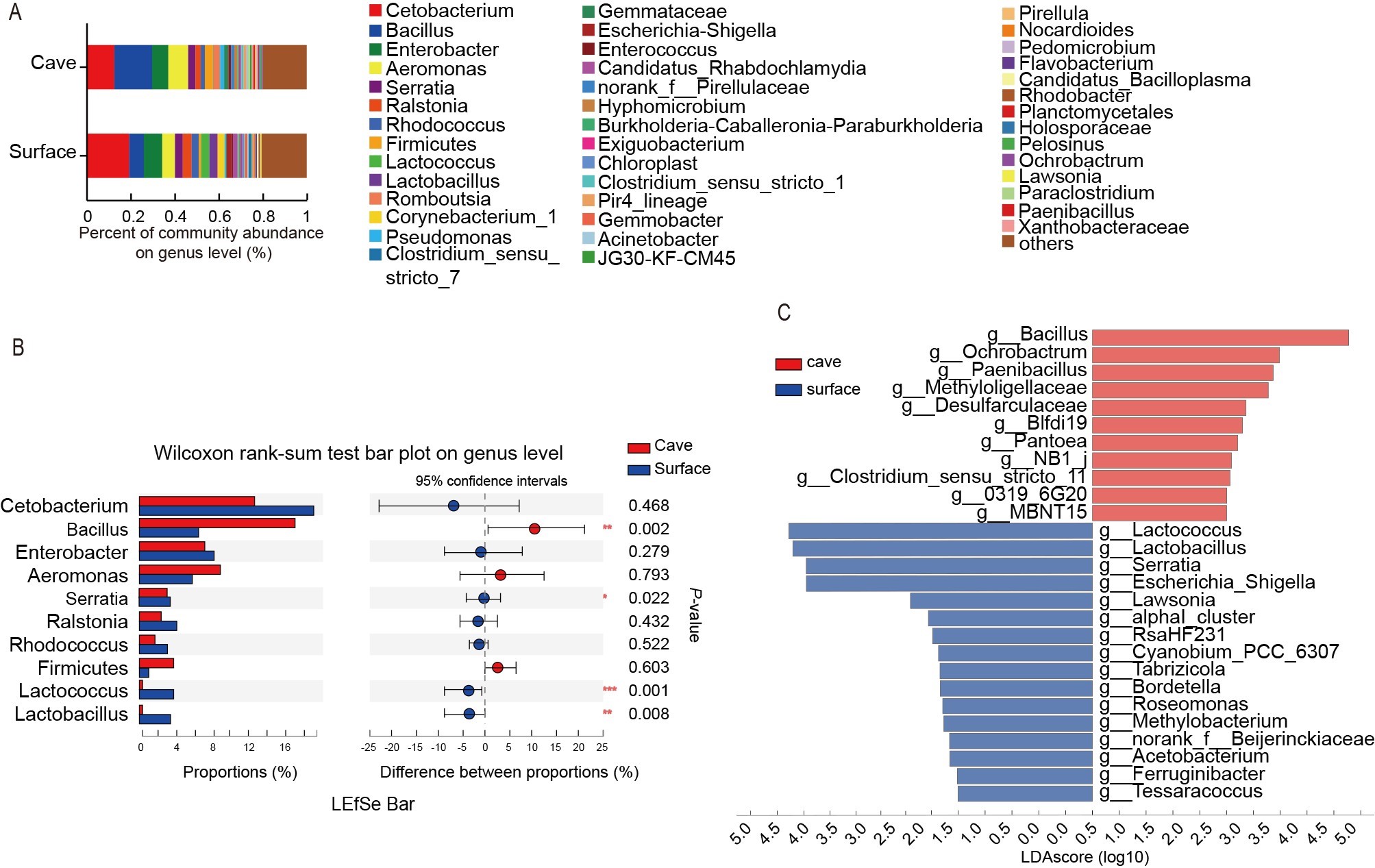图2 金线鲃属洞穴型和地表型物种肠道菌群属水平比较分析