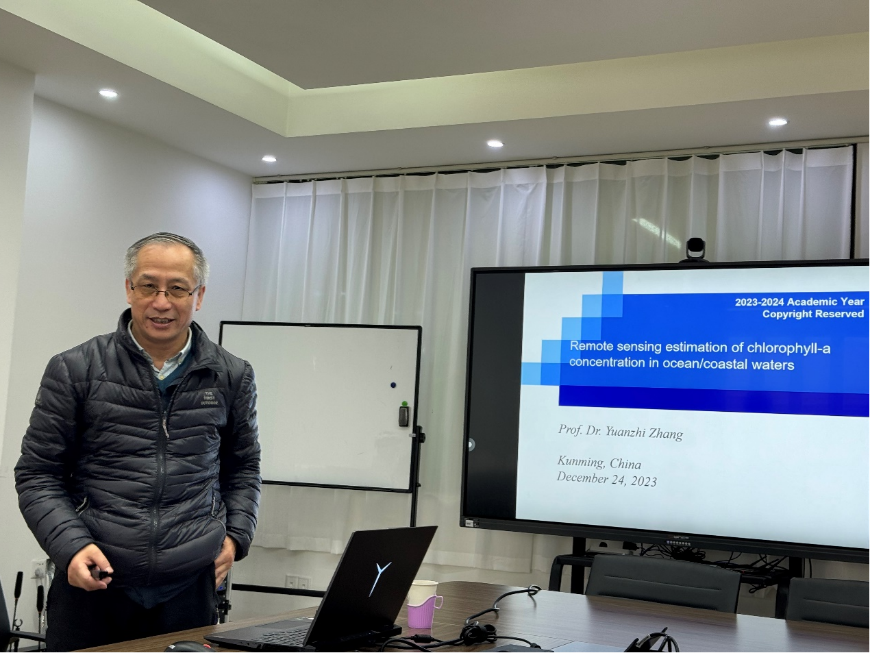 张渊智教授以“Remote sensing estimation of chlorophyll-a concentration in ocean/coastal waters”为题,首先介绍了遥感在水体环境监测领域的重要作用,然后详细介绍了水体叶绿素浓度反演的相关机理与模型构建,最后以珠江口叶绿素浓度监测为例介绍了遥感技术在水质监测中的应用。张教授的报告得到在场师生的热烈反响,针对报告中的热点问题和前沿进展进行了深入讨论和交流。