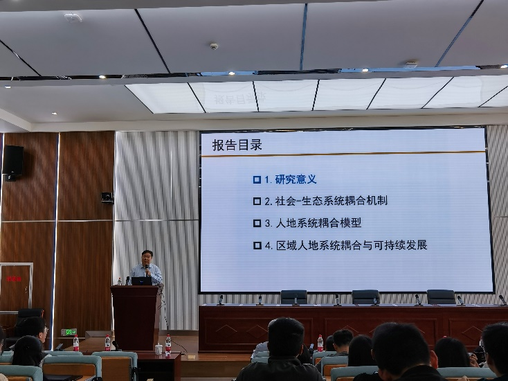 报告会后,傅伯杰院士与我校师生就人地系统耦合研究进行了深入交流,傅伯杰院士以矛盾论为例生动形象地讲解了如何在研究中抓住主要矛盾,简练而不简单地解决人地冲突问题,以及如何协调生态环境保护与社会经济效益以实现社会-生态系统可持续发展。
