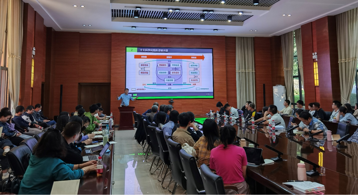 报告会上,彭建教授从国内外的生态修复理念引出国土空间生态修复的理论内涵,进一步介绍了国土空间生态修复的发展历程。阐述了修复前、修复中和修复后三阶段面临的主要科学问题,从参照系统、规模阈值、要素耦合、空间连通、权衡效率、动态适应尺度级联、成效评估、贡献厘定和文化韧性及其间的逻辑关系向大家介绍了国土空间生态修复的前沿认知。彭建指出,国土空间生态修复的本地化设计、系统性治理、生态完整性强化、多层级途径统一、修复效用厘定、人类需求保障、人地关系协调机制等是未来国土空间生态修复的重要研究方向。报告后,在场师生就目前我国国土空间生态修复面临的难点,与彭建教授进行了深入交流。彭建对老师和学生们提出的前沿性问题进行了耐心解答,加深了大家对讲座内容的理解。