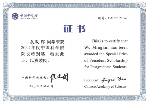 “中国科学院院长特别奖”(以下简称“院长特别奖”)是中国科学院(以下简称“中科院”)对在学研究生的最高奖励。获此殊荣的研究生学业优异,在学期间取得具有重要学术价值的科研成果,或在理论上有较重要的创新和发展,或在技术上有较大的突破并获得显著的经济效益和社会效益,或在其他方面做出重要贡献。bat365中文官方网站讲师吴明辉,荣获2022年度院长特别奖。