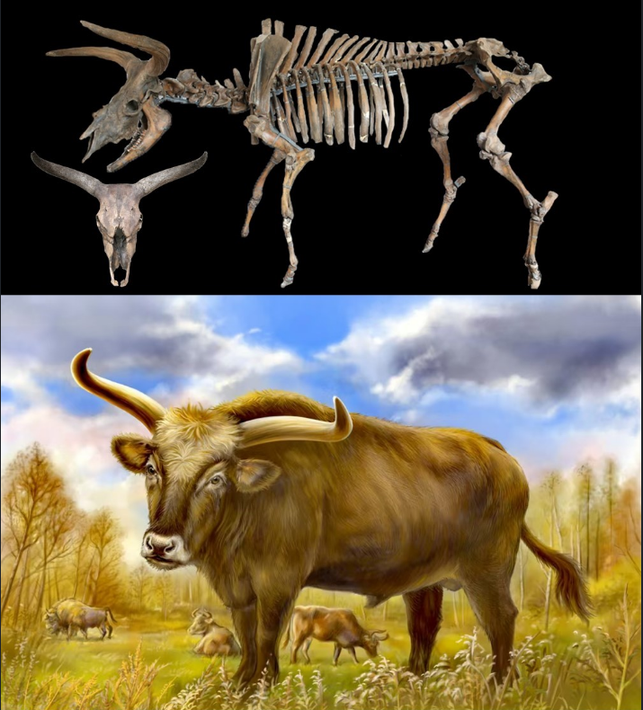 图1. 我国东北松嫩平原原始牛骨架(上,原图由彭耀庆提供)、张氏中华原牛复原图(下,张虎才构图、设计)