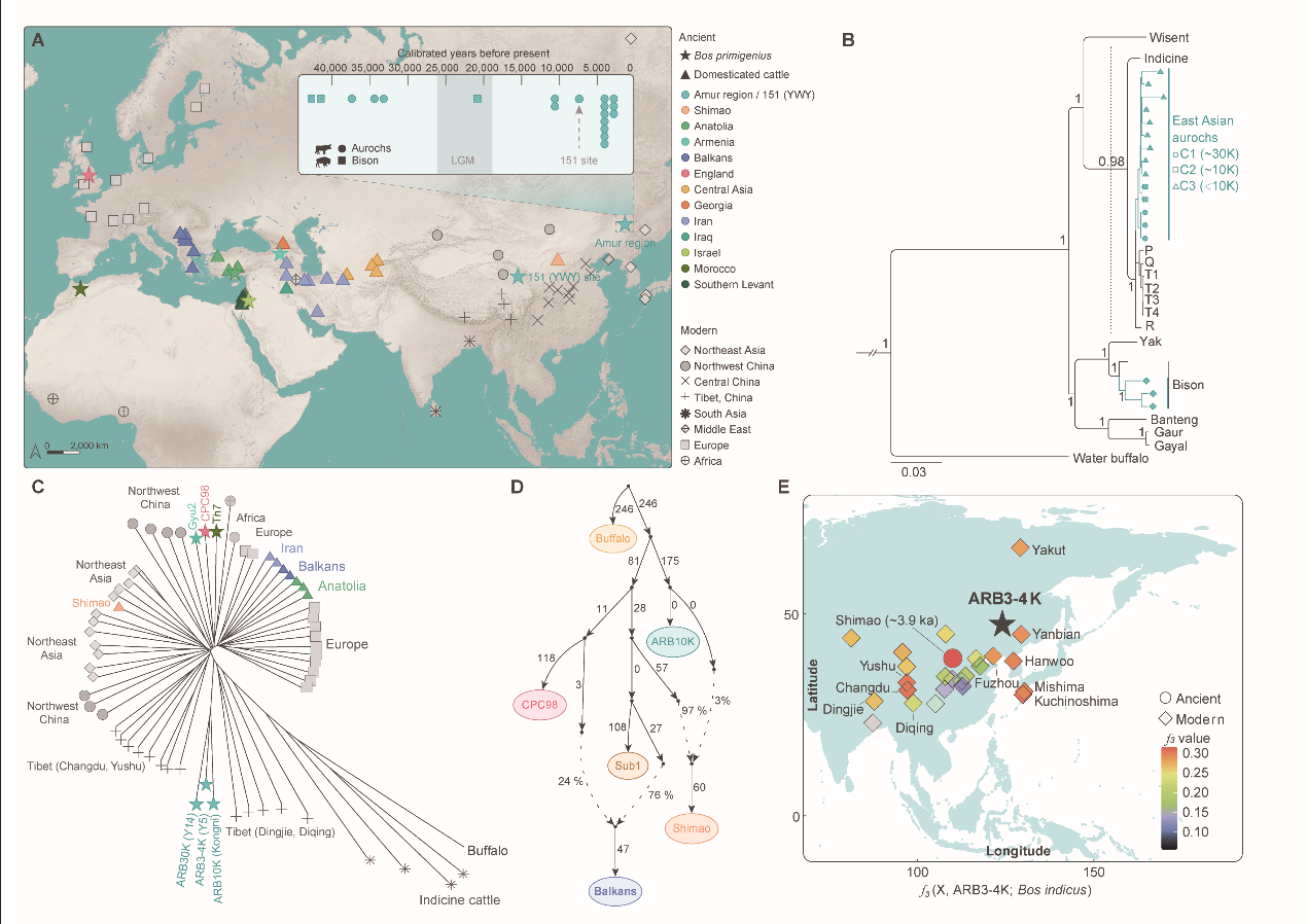 3. 通过全球古代化石种和现代家牛的基因组数据对比分析,发现东亚原牛对东亚早期家牛具有3% – 7%的遗传贡献,表明了家牛在东亚的二次驯化,即在家牛管理过程中吸收了当地原牛的血统,这可能促进并有利于家牛在迁徙过程中对新环境的快速适应。研究结果显著提高了我们对已灭绝东亚原牛的认识。
