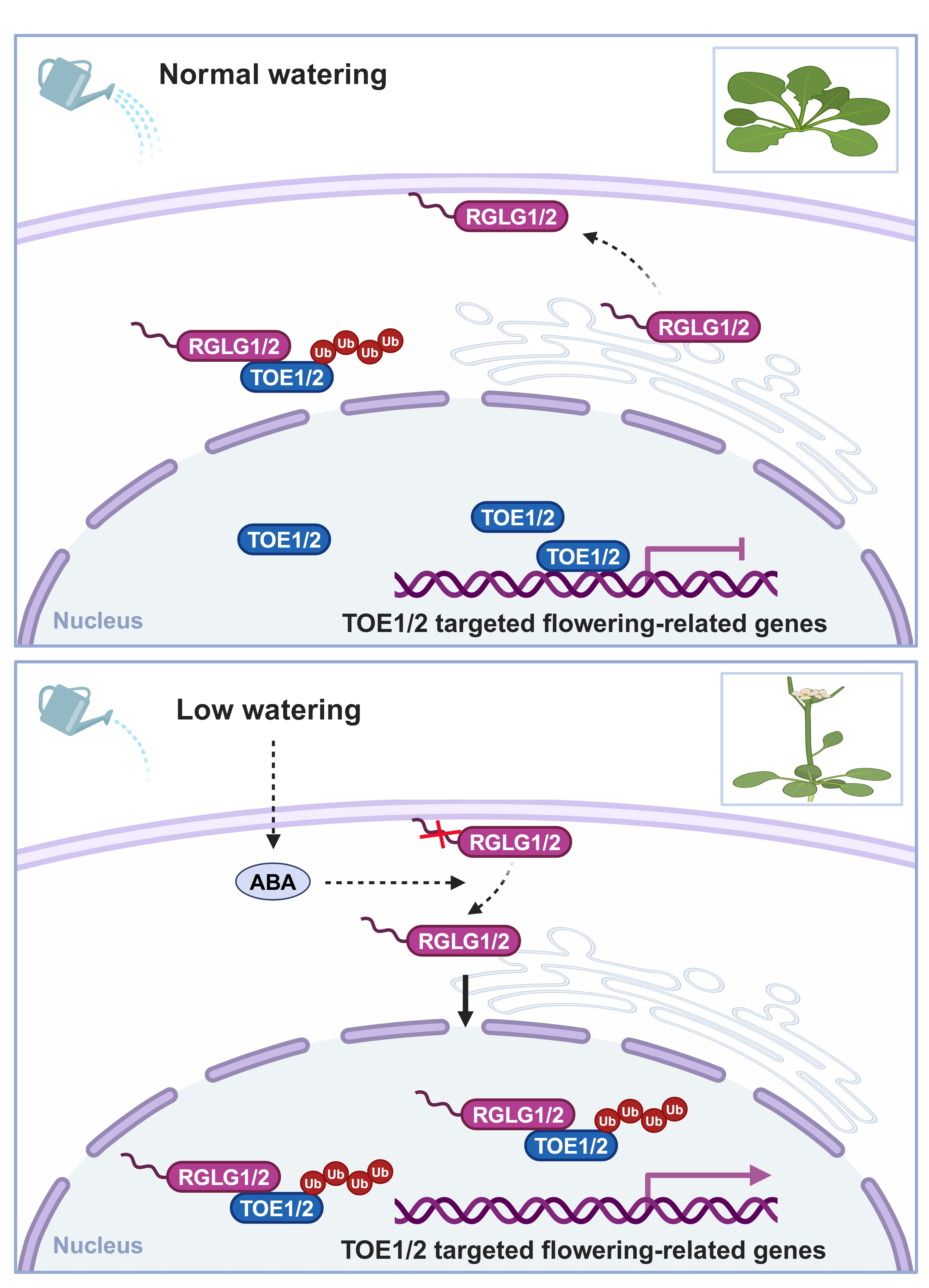 通过分子生物学以及遗传学等手段,该团队揭示RGLG1/2-TOE1/2信号在水分充足与水分相对缺乏的条件下的开花调控作用机制。在充足的水分条件下,RGLG1/2主要定位在细胞膜上,与TOE1/2蛋白的相互作用有限,使得TOE1/2能够抑制下游开花基因的转录,从而维持植物的典型开花表型。然而,在干旱条件下,植物体内的ABA信号上调,促使RGLG1/2从细胞膜转移到细胞核中,并与TOE1/2发生更强烈的相互作用。这种相互作用导致TOE1/2蛋白含量显著降低,解除其对相关开花基因的抑制,进而诱导植物早期开花(图1)。