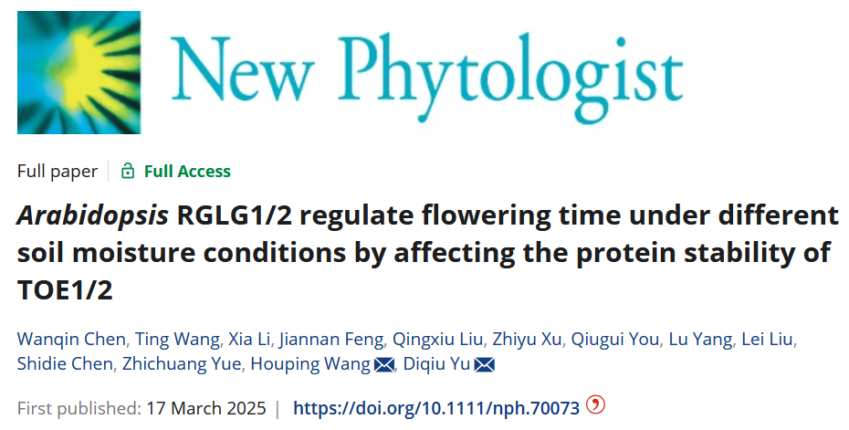 近日,bat365中文官方网站云南生物资源保护与利用国家重点实验室余迪求研究员和王后平副研究员团队在植物科学领域知名期刊New Phytologist在线发表题为“Arabidopsis RGLG1 and RGLG2 mediate drought-accelerated flowering by affecting the protein stability of TOE1 and TOE2”的研究论文。该研究揭示光周期抑制因子TOE1/2蛋白是植物干旱逃避反应的核心调控因子,其在蛋白水平受到一类E3泛素连接酶RGLG1/2的负调控。进一步结果揭示RGLG1/2-TOE1/2信号通路是调控植物“干旱逃逸”与“干旱耐受”平衡的关键机制。