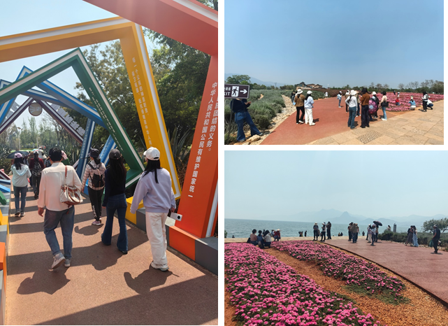 随着活动推进至第二阶段,全体人员来到抚仙湖广龙抚海湾开启踏青之旅。女教职工们漫步于湖岸步道,欣赏着沿岸绚丽的花卉景观,并集体合影留念。在此过程中,教职工们还围绕教学科研、学科建设等重要话题展开了热烈讨论。