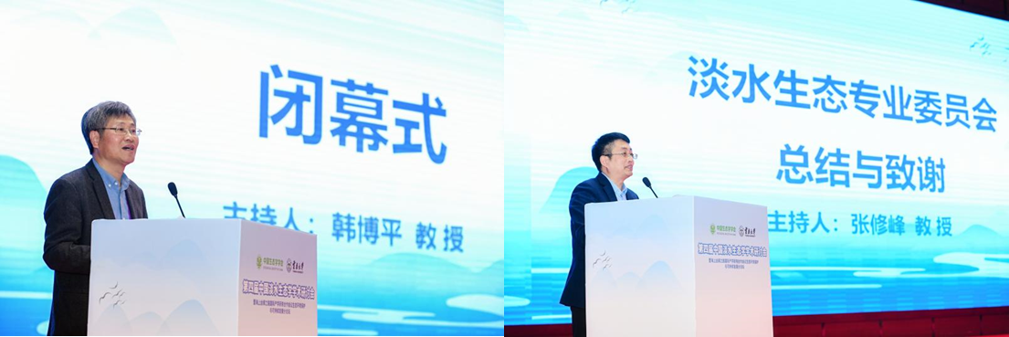 闭幕式上,会议学术指导委员会副主任韩博平教授和吴庆龙研究员等分别向获奖研究生颁发了研究生口头报告奖和学术墙报奖;中国生态学学会淡水生态专业委员会副主任兼秘书长、暨南大学生态学系张修峰教授对会议进行了总结;韩博平教授在闭幕式上致辞,回顾了淡水生态专业委员会的发展历程,展望了淡水生态学领域的未来发展方向。