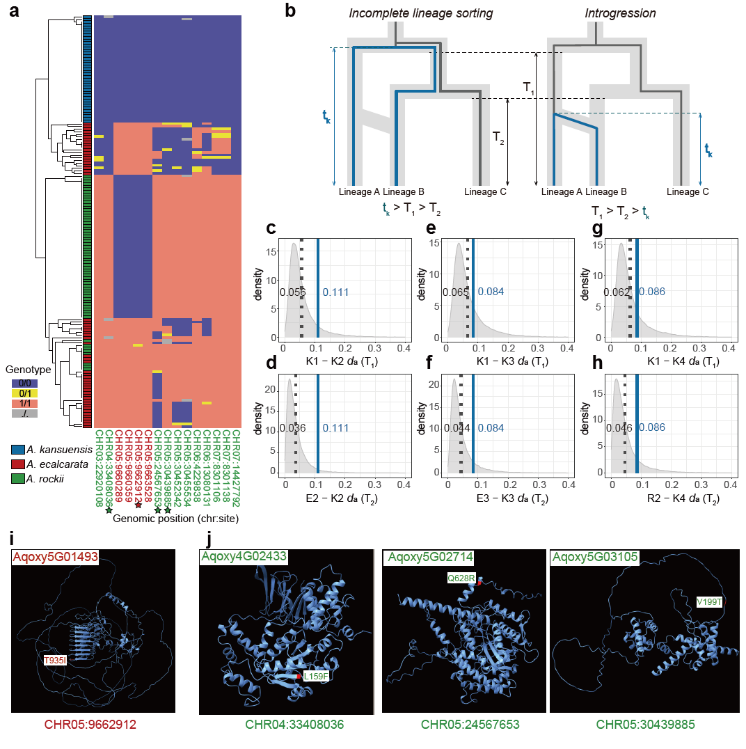 图2 甘肃耧斗菜固定分化位点的演化分析结果。(a)固定分化SNP位点的单倍型聚类。星号标记为位于基因编码区域的位点,均为非同义突变,同时固定位点在基因组上呈现聚集,符合单次起源的旁系演化(collateral evolution)特征。(b)固定分化位点演化假设的图示,进一步用于解释甘肃耧斗菜中固定位点单次起源的两种演化假设,即不完全谱系分选(左)和渐渗(右)。(c-h)甘肃耧斗菜隐存谱系和姐妹谱系之间的形态关联位点和谱系分化程度的比较。蓝色直线代表固定分化位点的分化程度,而黑色虚线代表所有位点的分化程度,均以平均da 来代表。(i和j)Alphafold预测的四个关联基因的蛋白质结构。
