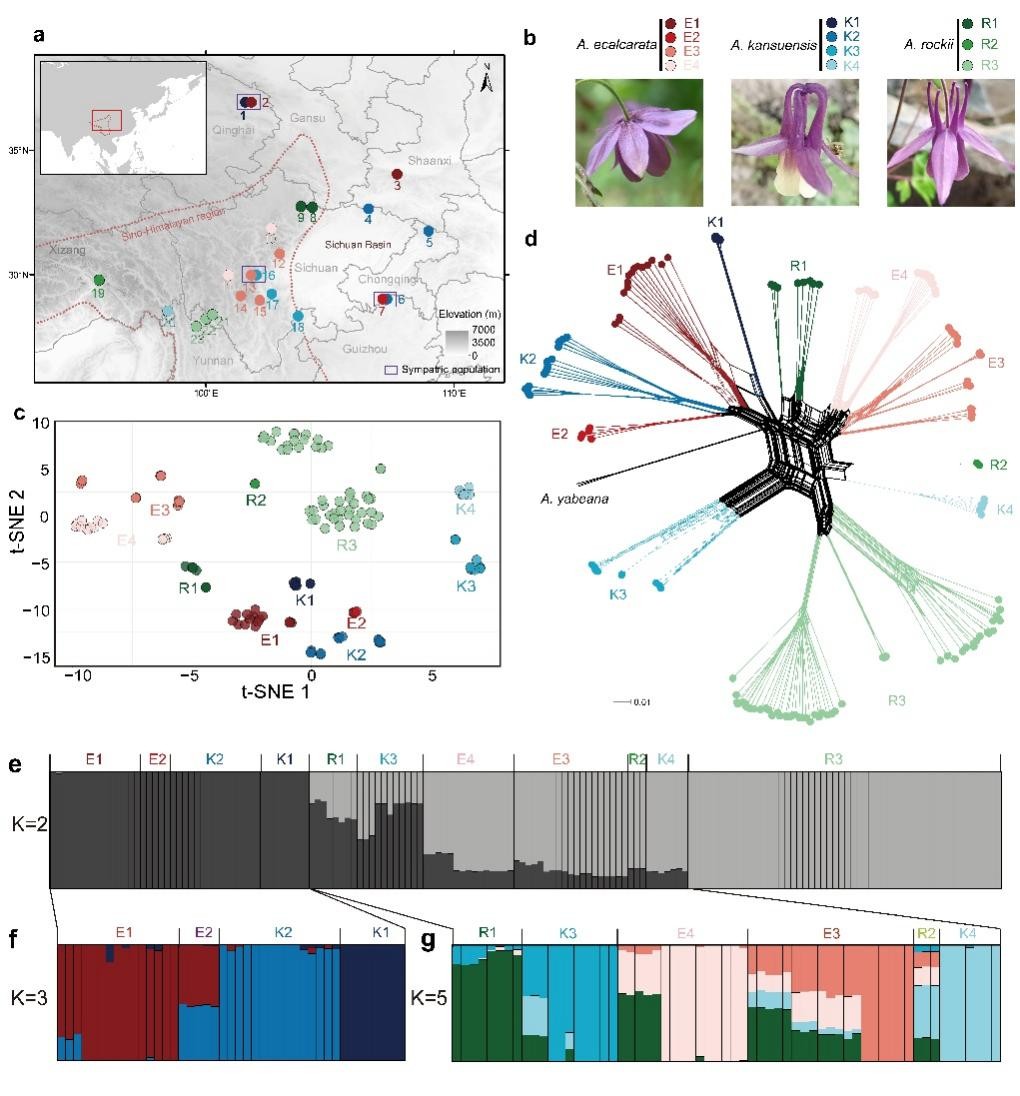 图1 西南山地耧斗菜属物种的遗传结构和进化关系。(a)本研究中23个群体采样分布图。(b)形态物种的花部照片(c)基于全基因组不连锁SNP数据集的t-sne 结果。(d)基于距离的系统发育网络结果。(e-g)基于STRUCTURE软件推断的遗传结构。