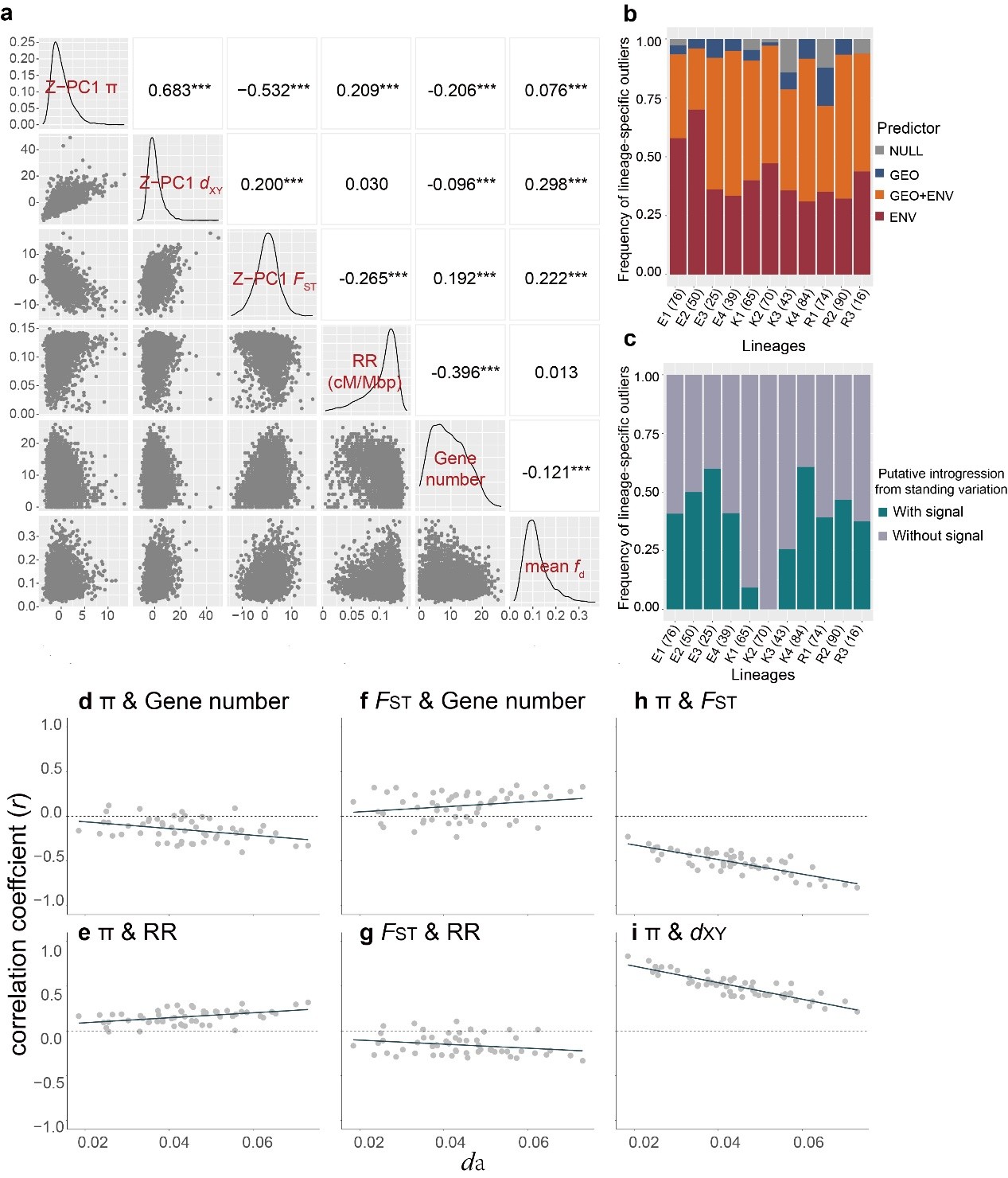 图3 基因组结构与遗传多样性之间的相关性。(a)基于100 kb非重叠窗口内估计的PC1 π、PC1 FST、PC1 dxy、平均fd、基因密度和重组率的成对相关矩阵。PC1,第一主成分。***为p < 0.001;**为p < 0.01;*为p < 0.05;无星号为p > 0.05。(b)基于DIC权重的谱系特异分化位点与环境和地理关联分化模式的比例。(c)非姐妹谱系间固有遗传变异渗入受体谱系异常位点的比例。(c)和(d)中括号内的数字表示每个谱系中检测到的谱系特异分化位点(Z-PBS > 2和Z-ΔFST >2)的数量。(d-i)55次谱系之间遗传变量比较的相关性(以灰点代表)与分化时间(以da平均值代表)的趋势变化。