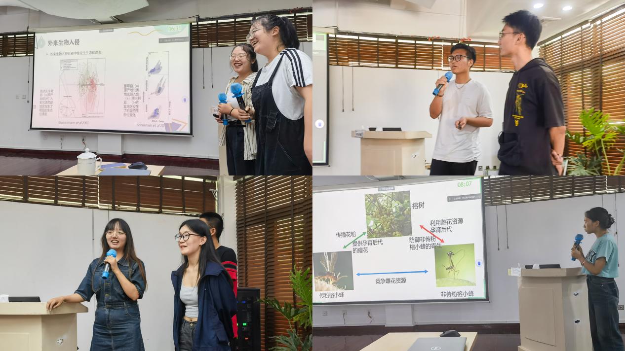 会上,4组本科生对自己在版纳植物园暑期科研实践期间的研究课题和学习收获进行分组展示和汇报。报告题目分别为《榕小蜂群落对聚果榕榕果特征的影响》、《大蚁蛛种内个体间识别研究》、《不同来源虎杖种群叶片的耐热性差异比较》、《榕树对于热带地区森林的恢复促进作用》,涵盖动植物关系、动物行为与生态、入侵植物生态、恢复生态等研究方向。